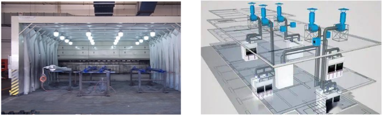 干式噴漆室是在噴漆房格柵下方設置干式過噴涂料分離系統。